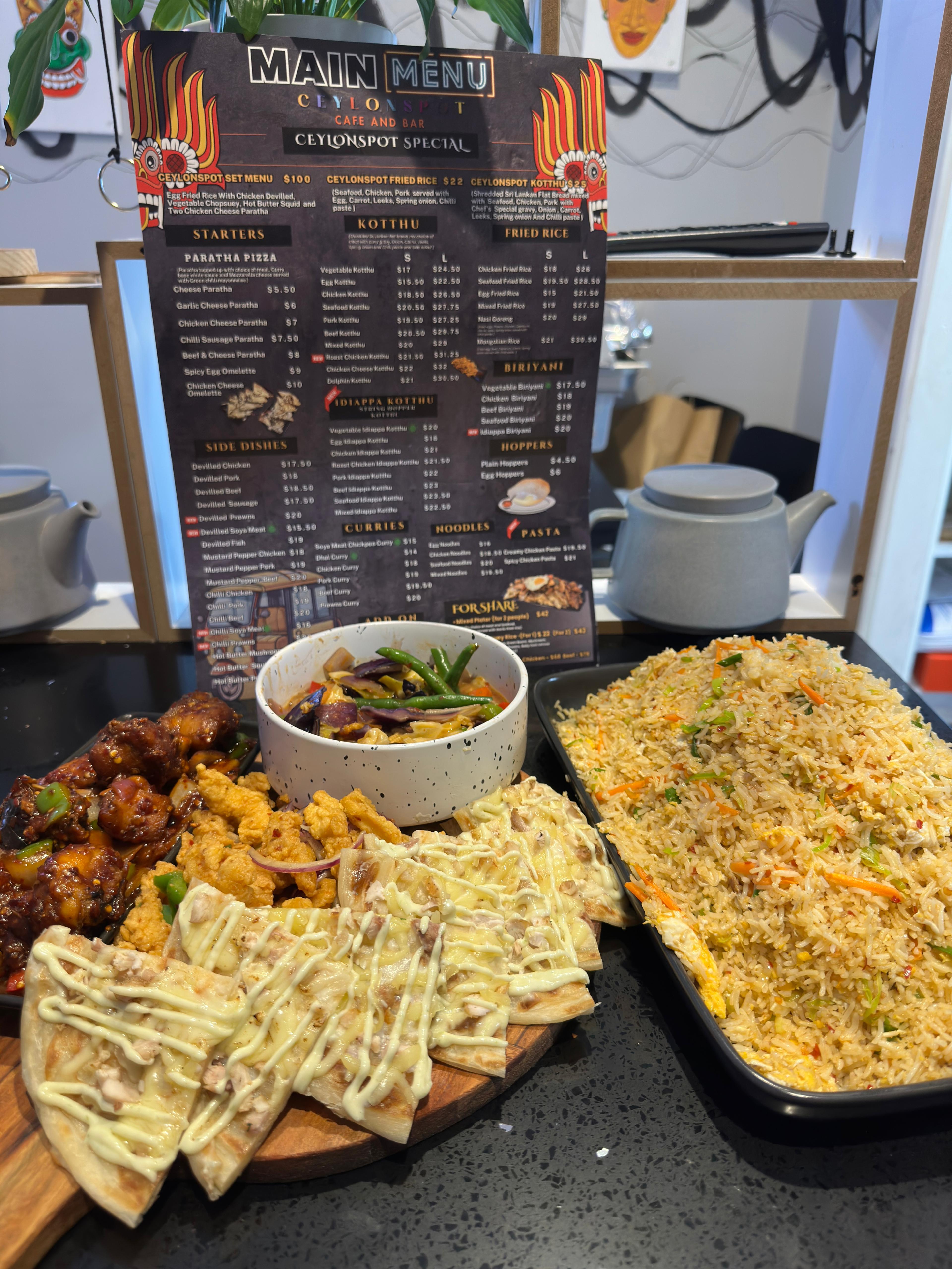 Egg fried rice served with devilled chicken, vegetable chop suey, hot butter squid, and two chicken cheese parathas